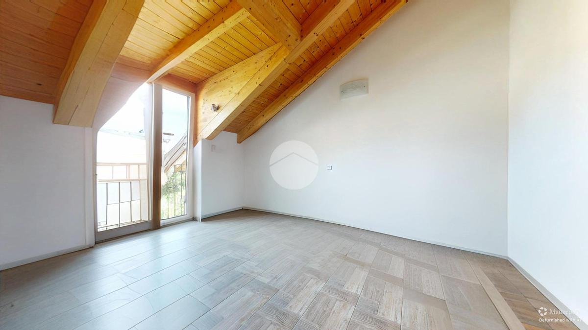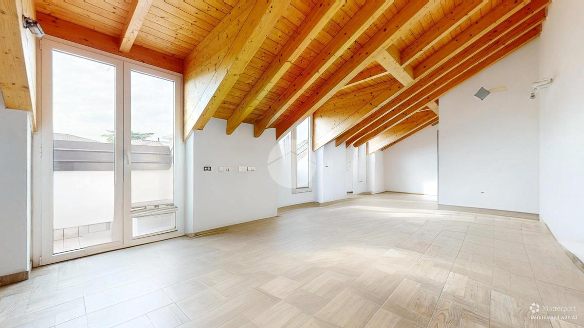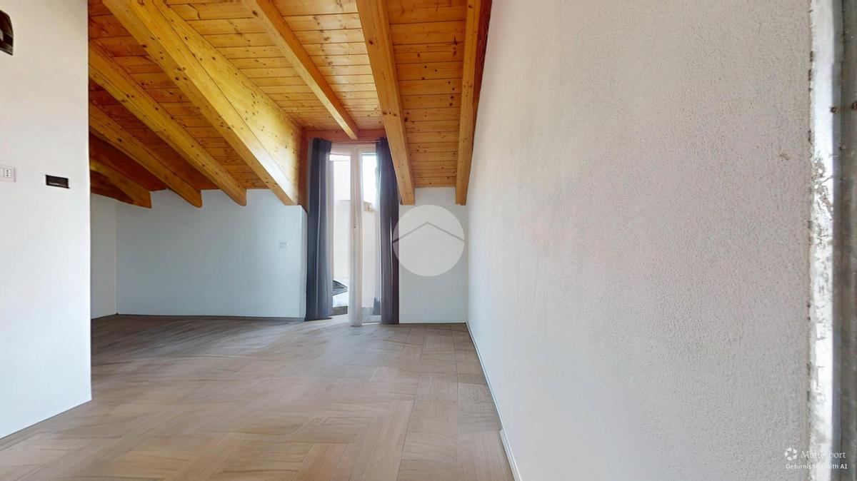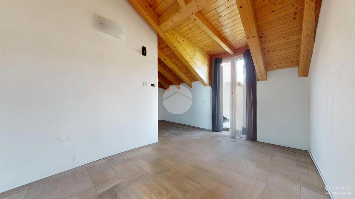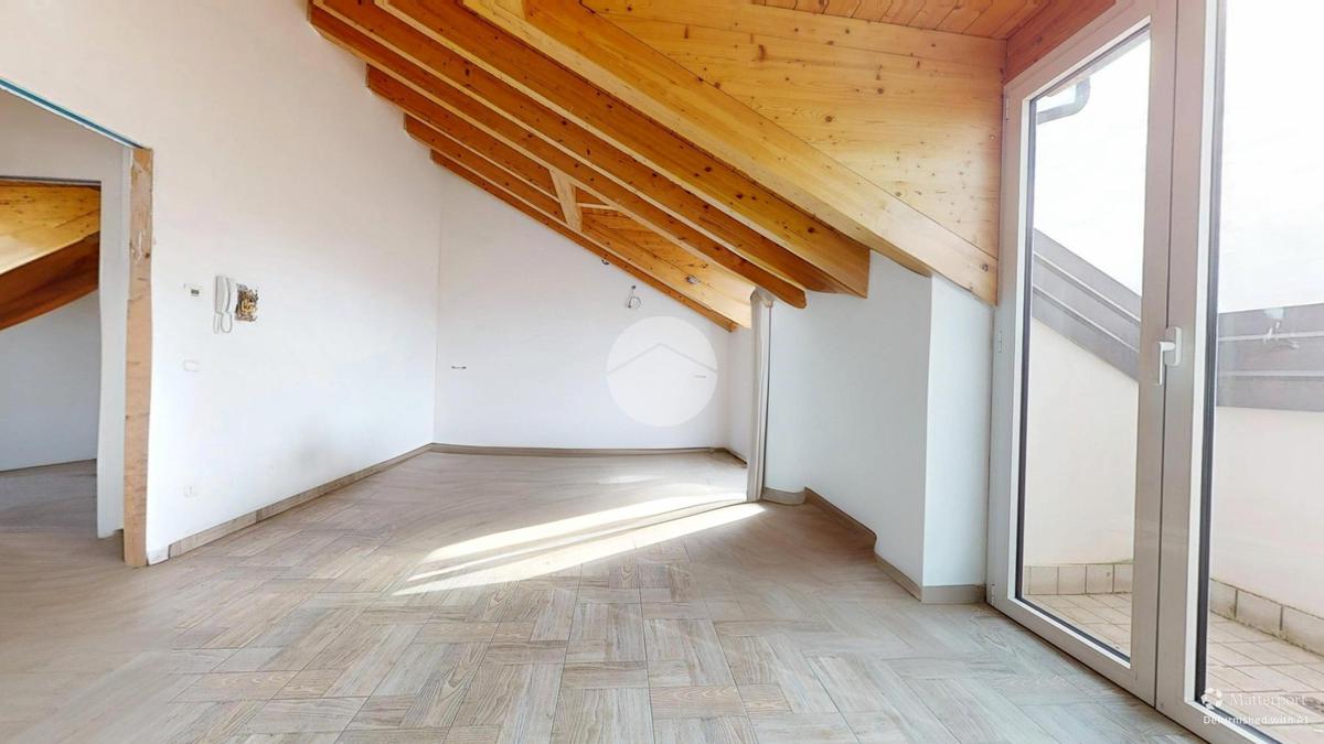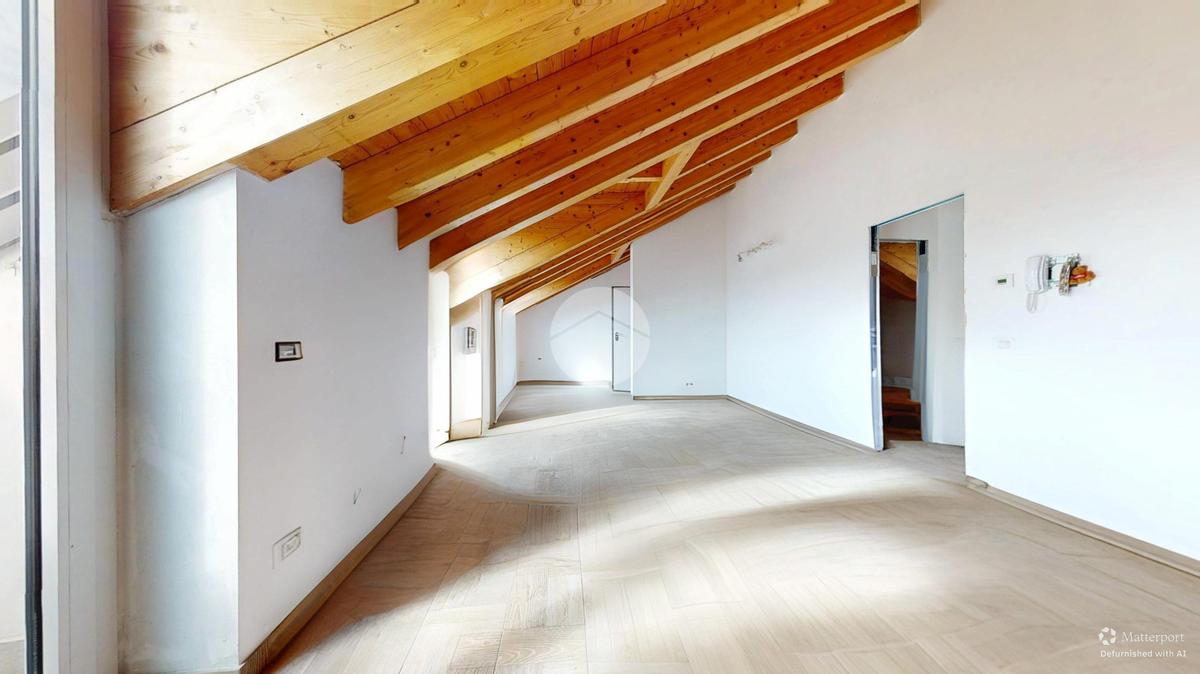 Dal soggiorno, un disimpegno conduce alla zona notte, garantendo privacy e separazione degli ambienti. La camera matrimoniale è spaziosa, accogliente, e ben rifinita, perfetta per garantire un ambiente intimo e confortevole. Le travi a vista tipiche della mansarda donano calore all'ambiente, creando una zona notte accogliente e personale.