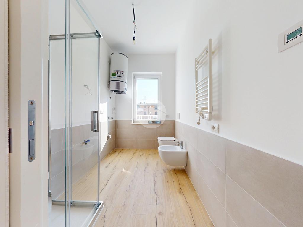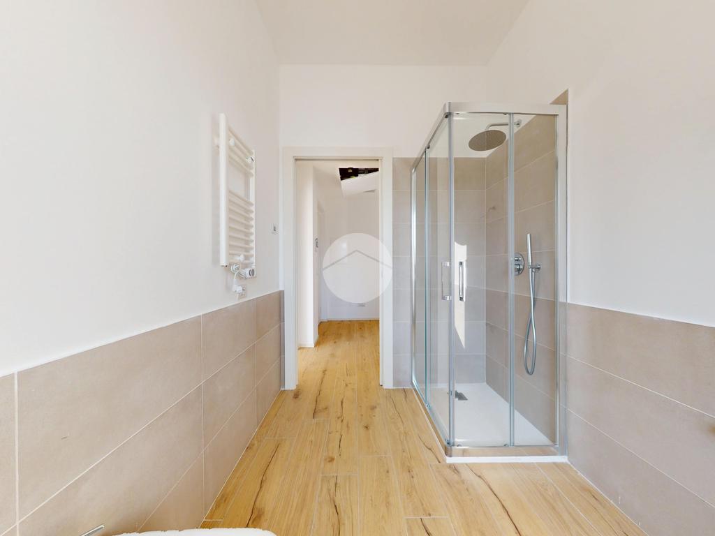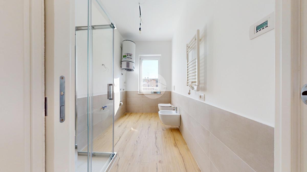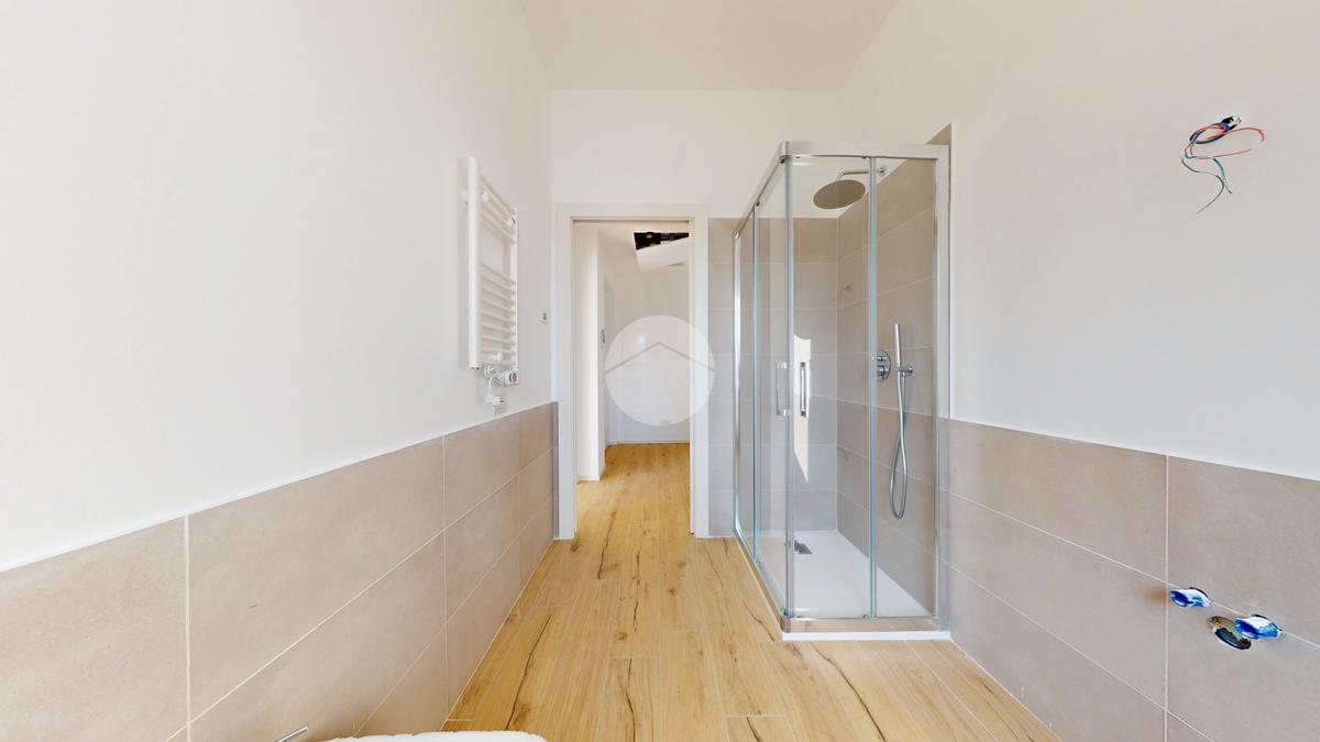 La zona notte comprende una spaziosa camera matrimoniale e un bagno con doccia Ultra Flat, sanitari sospesi Ideal Standard e rubinetteria di design.