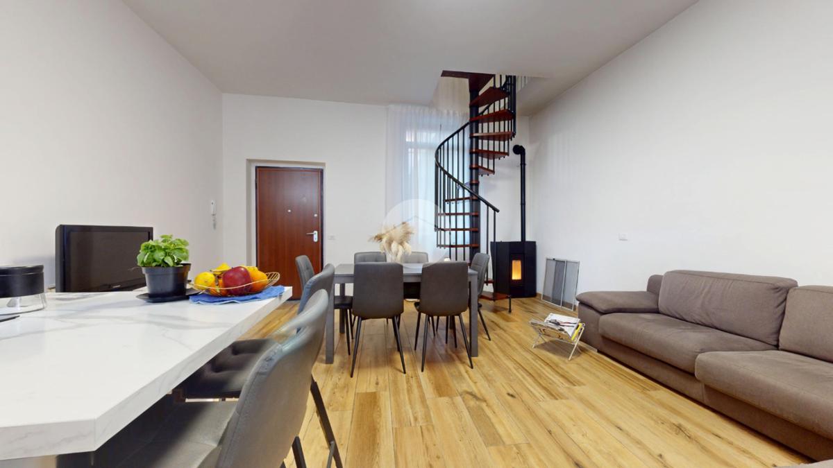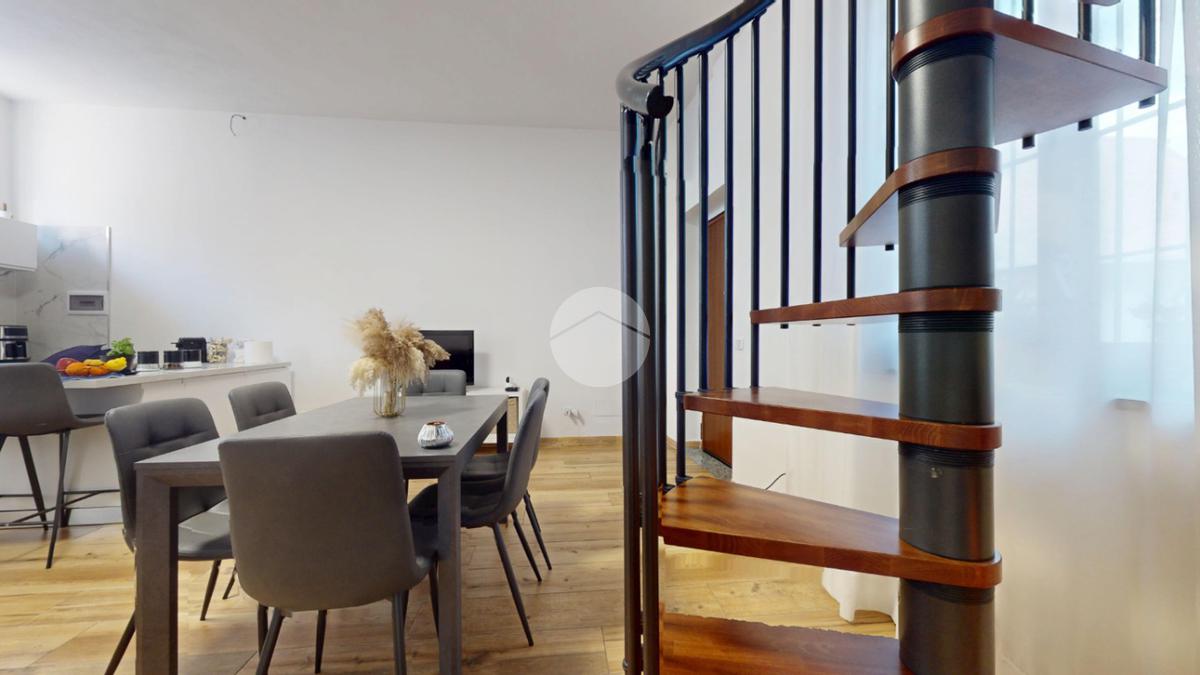 L’abitazione principale, di circa 87 mq, si sviluppa su due livelli e si distingue per una distribuzione interna dinamica e funzionale. Al piano terra si apre la zona giorno, composta da soggiorno e cucina open space, un ambiente accogliente e conviviale, perfetto per la vita quotidiana e per chi ama vivere la casa in modo pratico ma con carattere. A collegare i due piani troviamo una scenografica scala a chiocciola, elemento che dona personalità all’immobile e accompagna al livello superiore.